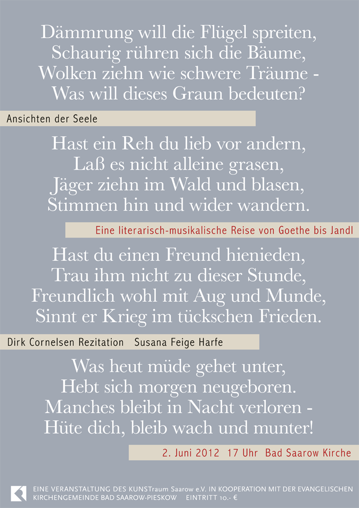Veranstaltungsplakat für eine musikalische Lesung des KunsTraum Saarow
